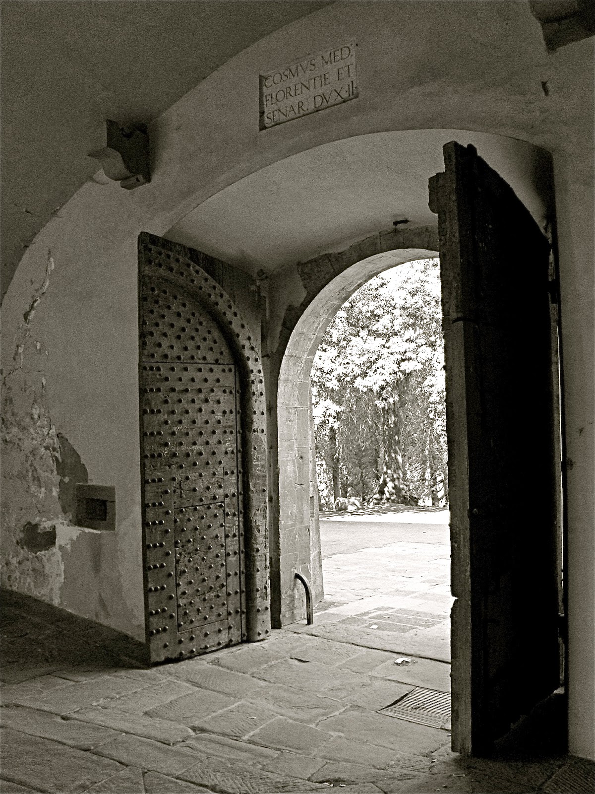 | Up on a hill overlooking Florence is the beautiful 12th-century basilica of San Miniato. For me, a visit to Firenze is not complete without a hike up here. After spending some time in the church and in the cemetery, I step through this doorway to head back down to town. [Linking back to The Weekend in Black and White and also to inSPIREd Sunday.] |